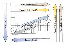 Radio atómico: Básicamente es la distancia que hay entre el centro del núcleo hasta el electrón más externo.Potencial de ionización: Es la energía que hay que entregar para arrancarle el electrón más externo a un átomo en su estado neutro y gaseoso. La electronegatividad es una medida de la capacidad de un átomo (o de manera menos frecuente de un grupo funcional) para atraer a los electrones, cuando forma un enlace químico en una molécula. También debemos considerar la distribución de densidad electrónica alrededor de un átomo determinado frente a otros distintos, tanto en una especie molecular como en sistemas o especies no moleculares. El flúor es el elemento con más electronegatividad, el Francio es el elemento con menos electronegatividad.